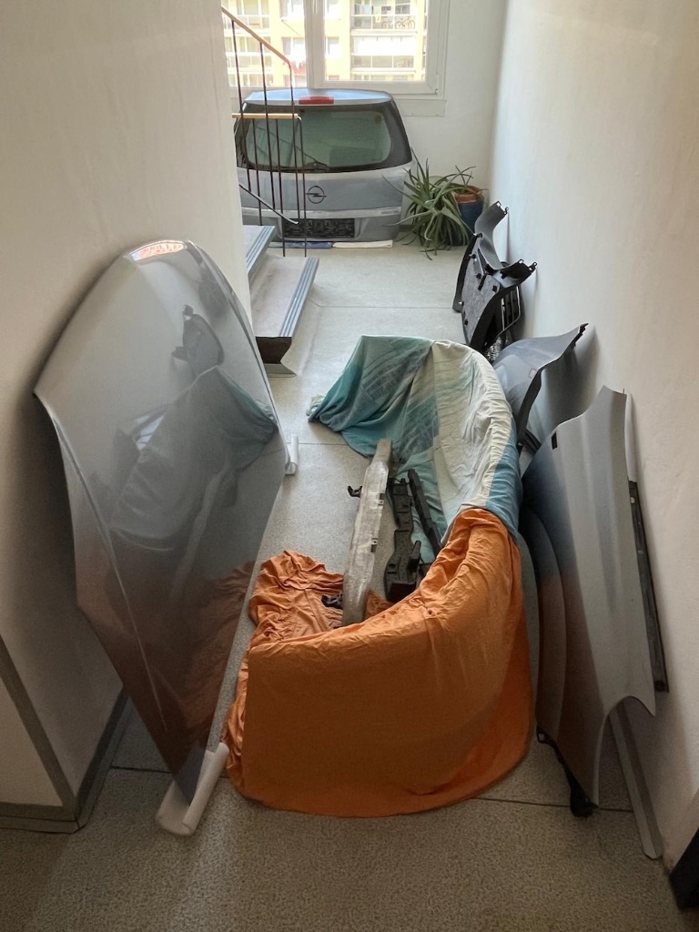 V mém případě jsem už párkrát řešil opakující se vady, táhnoucí se i několik let. Ten strávenej čas pod autem bych ještě skousnul, ale když to bere i peníze a výsledek se pořád nedostavuje, je to frustrující. Navíc mám karmickou smůlu na debily za volantem na našem sídlišti a za posledních 10 let strávených parkováním na sídlišti mám auto, na kterém snad není jediný panel ve 100% stavu. Odřeniny, škrábance, promáčkliny... A to si místo na zaparkování vždy pečlivě vybírám. Nedávno jsem narazil na hezkého "dárce" na vrakovišti a Astrule už brzy dostane omlazovací kůru. Takhle to aktuálně vypadá u nás na chodbě...