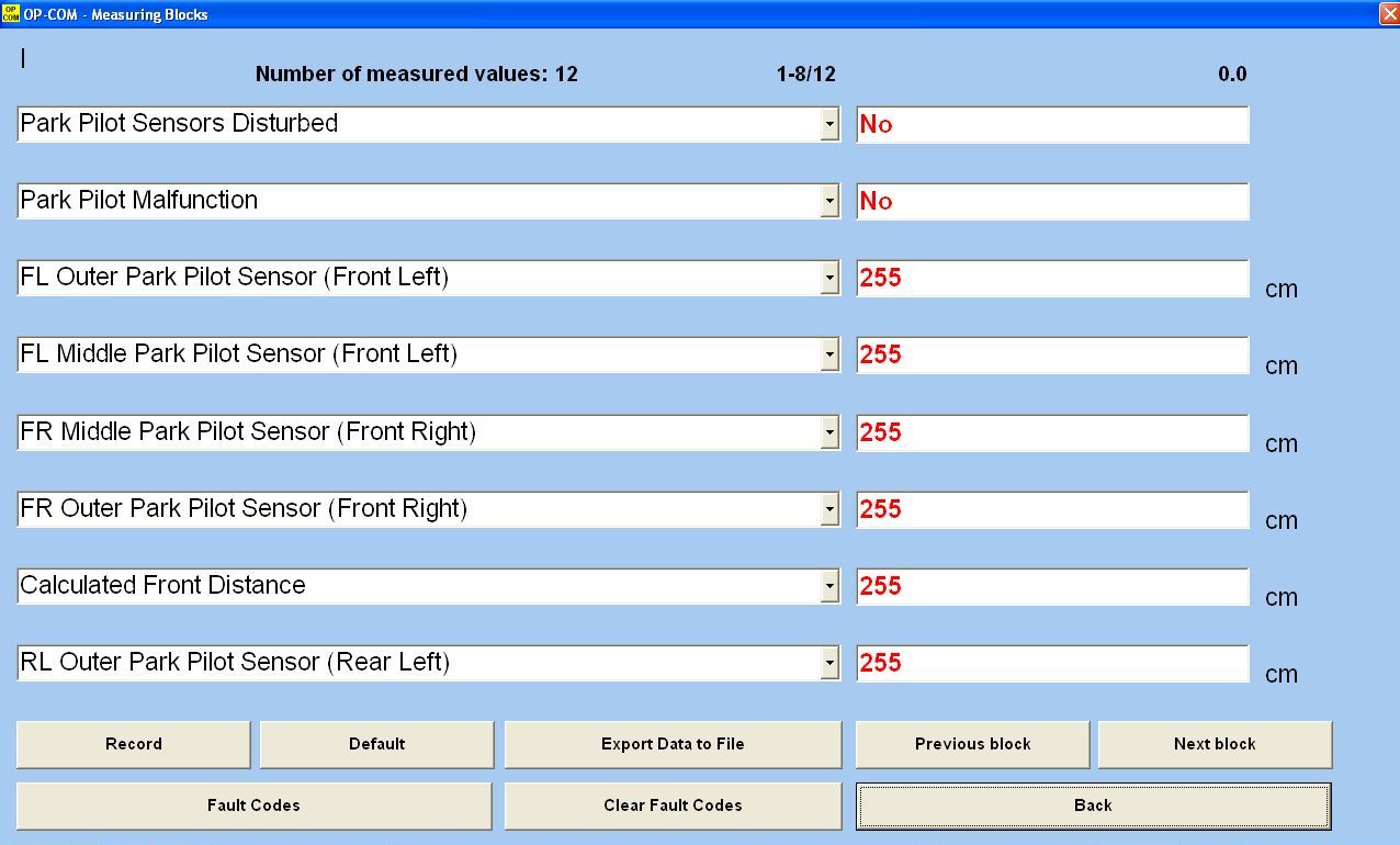Pri prvom vycitani chyb parkpilota naskacu vsetky tieto chyby: Zaroven OP com ukazuje tieto namerane hodnoty z cidiel. Vsetky ukazuju hodnotu 255 (aj predne aj zadne senzory) Ak chyby vymazem, vzdy sa hned vrati chyba B1350-02 (Parkpilot Sensor Voltage Supply Low Voltage) Ostatne chyby naskacu az po nejakom case jazdenia. Nikde sa nemozem docitat co znamena tato chyba, respektive chapem tu hlasku len neviem ci je vadny konkretne jeden senzor alebo viac. Ak je to vada senzora/senzorov ako zistim ktory to je? Pripadne kde moze byt problem ? Riadiaca jednotka parpkilota ? Ak sa s tym uz niekto stretol, budem vdacny za pomoc.