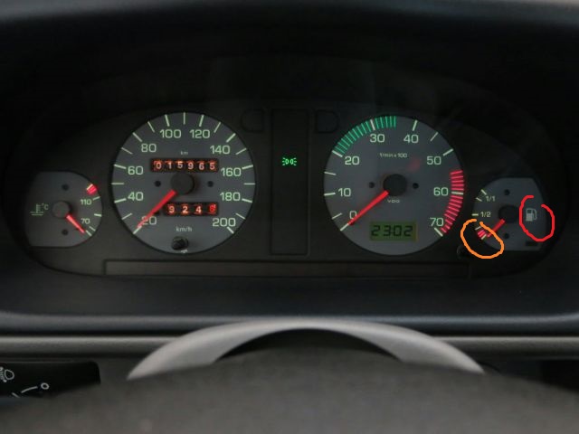 Je-li v nádrži už opravdu málo paliva a vše funguje správně, měl by se rozsvítit ten oranžový symbol čerpacího stojanu vpravo od ručičky. Většinou se začne rozsvěcet v zatáčkách, kdy se zbytek paliva navíc od plováku odstředivou silou odlévá, po projetí zatáčky může zase zhasnout, ale po určitých kilometrech se už rozsvítí trvale.