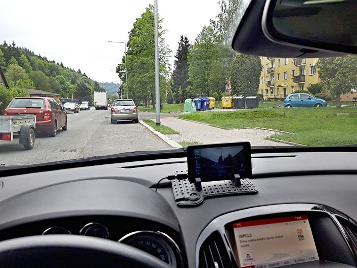 Překoná to i ten rantl na horní straně palubovky a i kamera navigace v telefonu (Sygic) či navigace (Navitel RE900) ještě zabírá dění před vozem. Právě ten rantl pomůže nastavit úhel kamery telefonu. Navigace má objektiv pohyblivý. Pořídil jsem si navigaci, bo telefon mi, při tom, jak na něj svítilo slunce, po čase zhasnul.