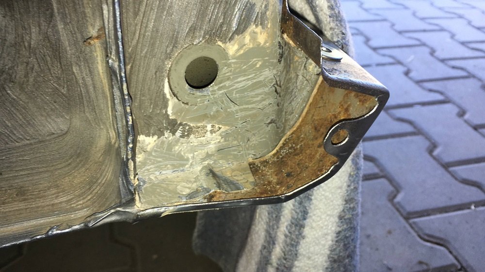 Co slo vybrousit ocelovym kotoucem jsem vybrousil, v zahybech a vnitrni casti prahu jsem vyskrabal stary tmel a pouzil smirkovy papir. Nemel jsem bohuzel k dispozici svarecku a zaroven jsem nechtel opravu prodluzovat (nebyla to moje garaz), tak jsem tu diru v prahu u ridice neresil. Navarena matka drzela festovne a plechu tam bylo jeste dost. Soustredil jsem se hlavne na dukladne odstraneni rzi. Foto vybrousenych blatniku jsem nekde potratil.