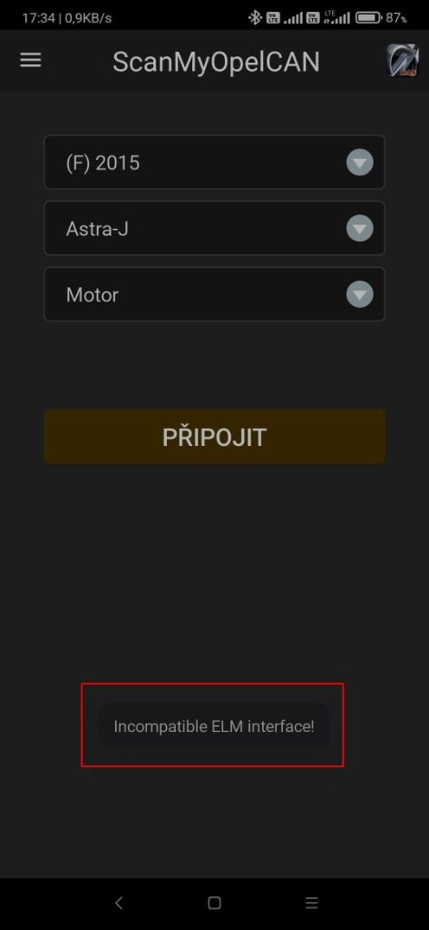 Stáhl jsem si poslední verzi 1.0.115, ale můj starší ELM327 adaptér nepozná, objeví se hláška "Incompatible ELM interface!". Přitom stejný adaptér mi funguje s aplikací Torque Pro už několik let.