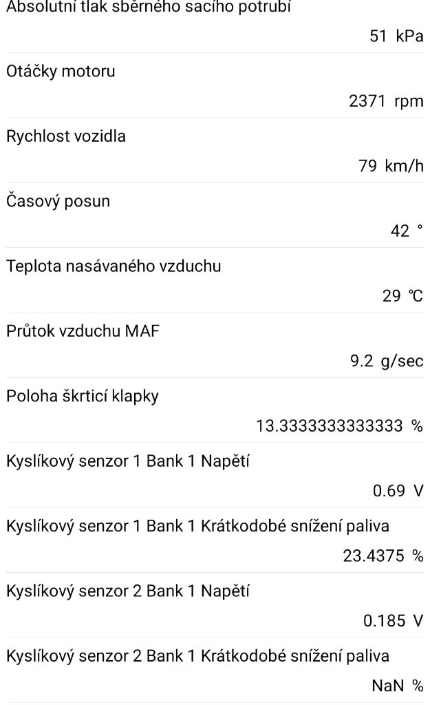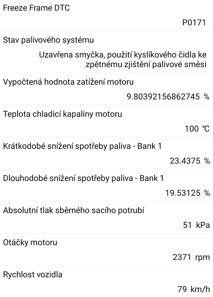 Tato chyba se mi už 3 roky objevuje, auto jede normálně jediné co pozoruju je kolisani otáček po startu, zahrate to nedělá. Diagnostika mi uložila hodnoty při vznikle chybě, vyzná se někdo prosím v těch hodnotách co by mohlo být špatně. Diky