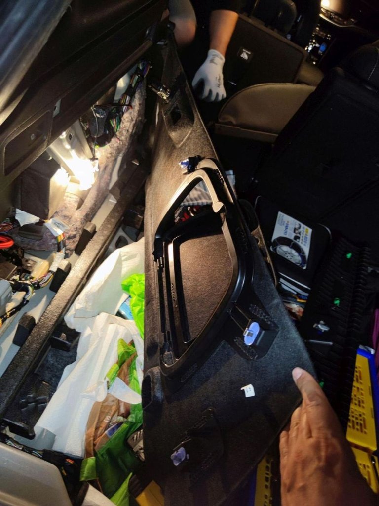 Teraz, kúsok po kúsku, zložte bočný kryt. Pozor, vedľa svetla som mal zapaľovač cigariet, ale dal sa ľahko odpojiť. Svetlo je možné ľahko vybrať a zatlačiť cez otvor v kryte. 4.) Ďalej je časť B, taktiež začnite znova vpredu (veko kufra) a sťahujte ho kúsok po kúsku. Potiahli sme to len kúsok, aby sme sa dostali na posledný panel (C). To je opäť prepojené s telom niekoľkými sponami (tiež opäť zelenými), nie som si istý, či boli 2 alebo 3. Na červenej 1 už vidíte dve zátky pre automatické dvere batožinového priestoru. Ako vidíte, ako na obrázku, časť C sme odsunuli iba o kúsok ďalej, aby sme sa dostali ku konektoru a odpojili ho.