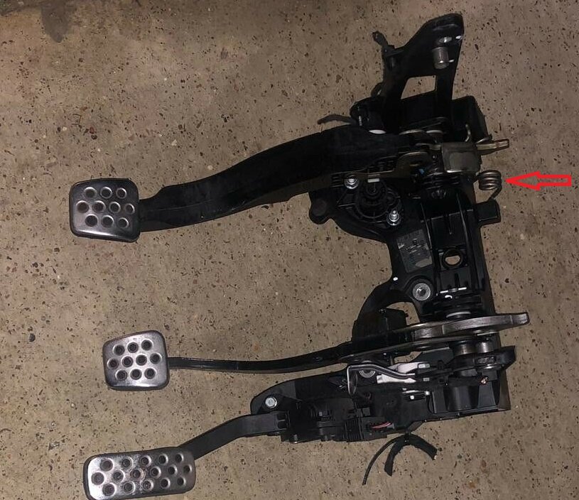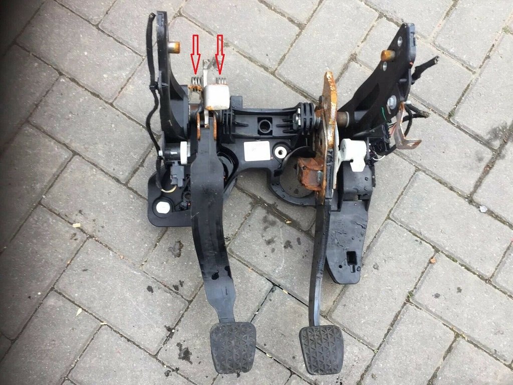 Vrzgajúci pedál (hlavne po dlhšom stáni na slnku) nie je problém len pružín, ale vŕzga hlavne ten plastový otočný čap pedálu - vidieť ho na druhom obrázku - teplom sa roztiahne a šúcha plast o plast na sucho. Na ruskom fore je postup (video), ako ho vymeniť za kovový.