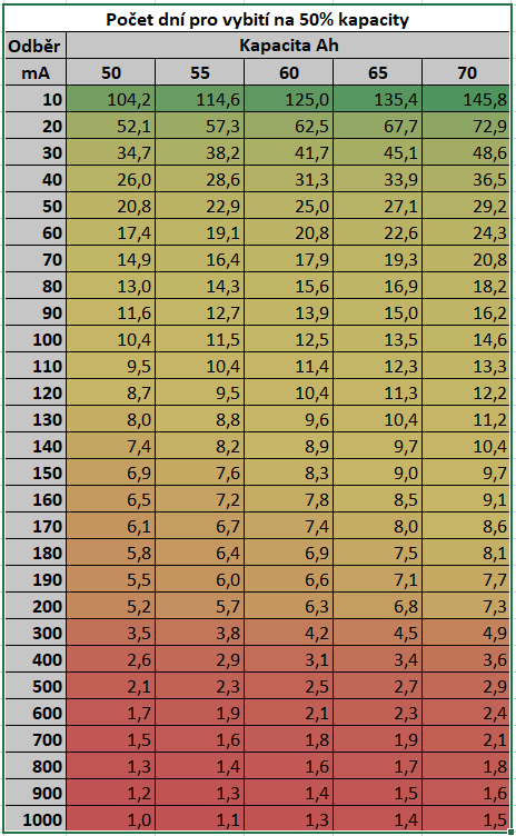 Podle toho se pak da dopocitat jak dlouho bude trvat, nez stav plne nabite baterie klesne pod hranicni mez nabiti 50%: