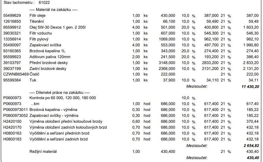 Ahoj, tak mám za sebou servis po 60k km při kterém mi dělali rovnou i brzdové obložení, vyměnili svíčky, dostal jsem dvě lahvičky aditiva... Děláno ve Zlíně. Cena přímo lidová, ceny s VIP slevou...