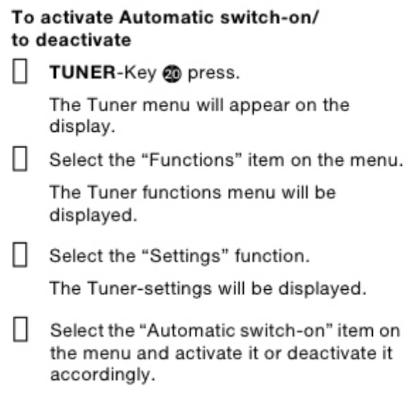 Zapni radio, stiskni Tuner, v menu vyber polozku Funkce -> Nastaveni (Functions->Settings) a pak Automaticke zapnuti (Automatic switch-on).